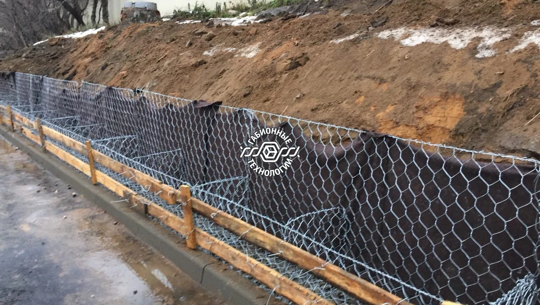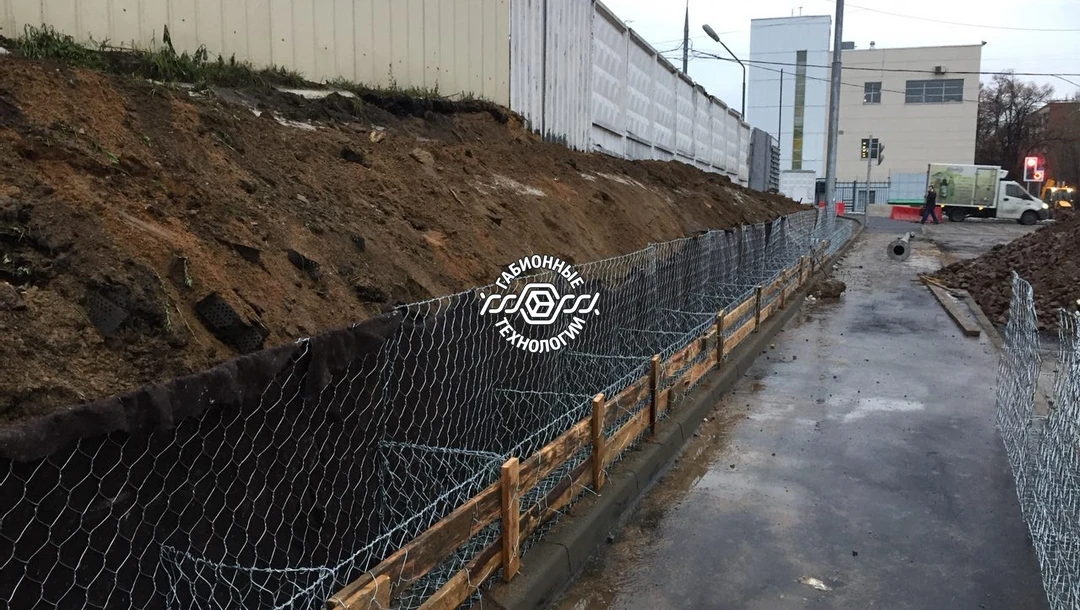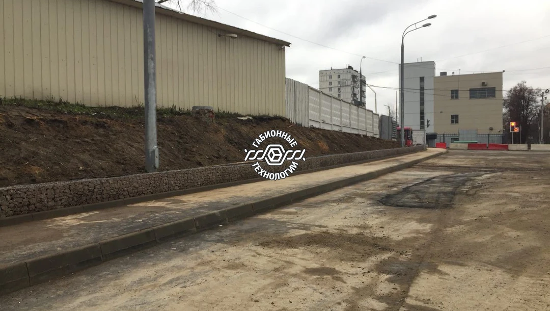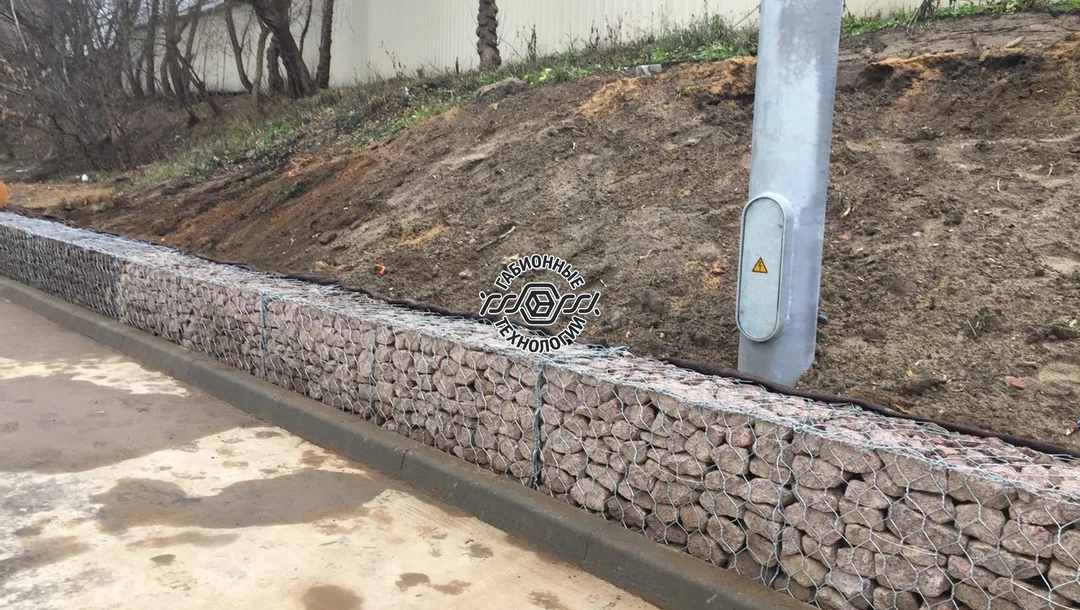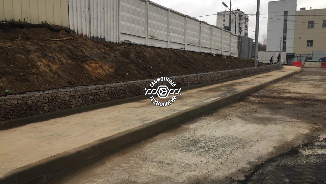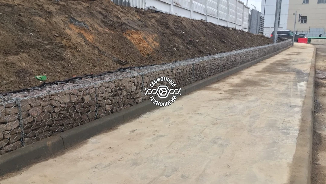Сотрудники ООО «Габионные Технологии» возвели подпорную стенку из коробчатых габионов длиной 60 п.м и высотой 0,5 м. Благодаря созданной конструкции склон перестал сползать на пешеходную зону, а сам тротуар получил симпатичный каменный бордюр. Работа заняла 5 дней.