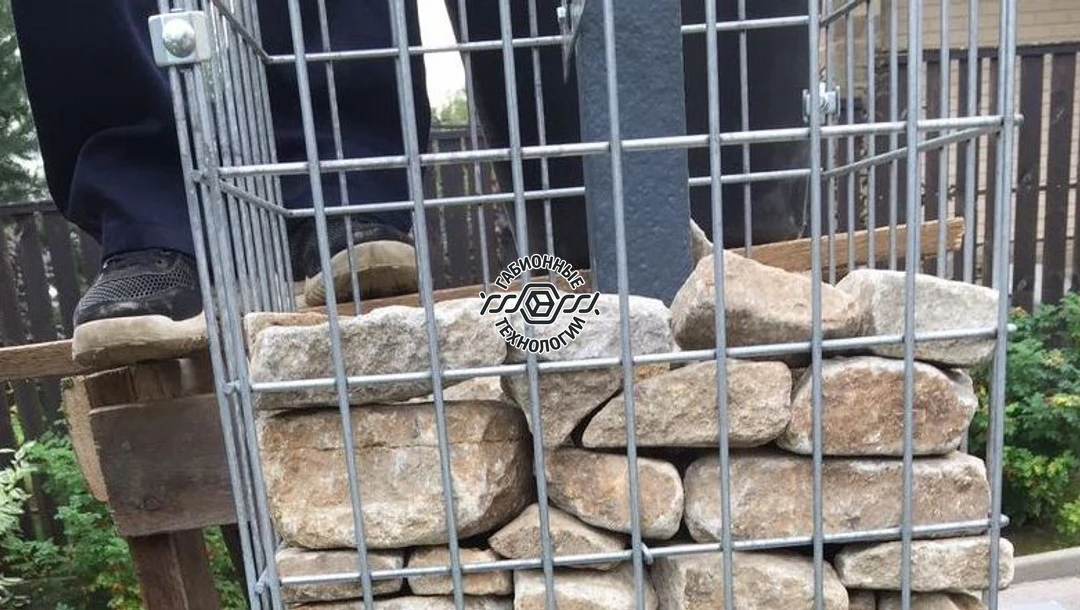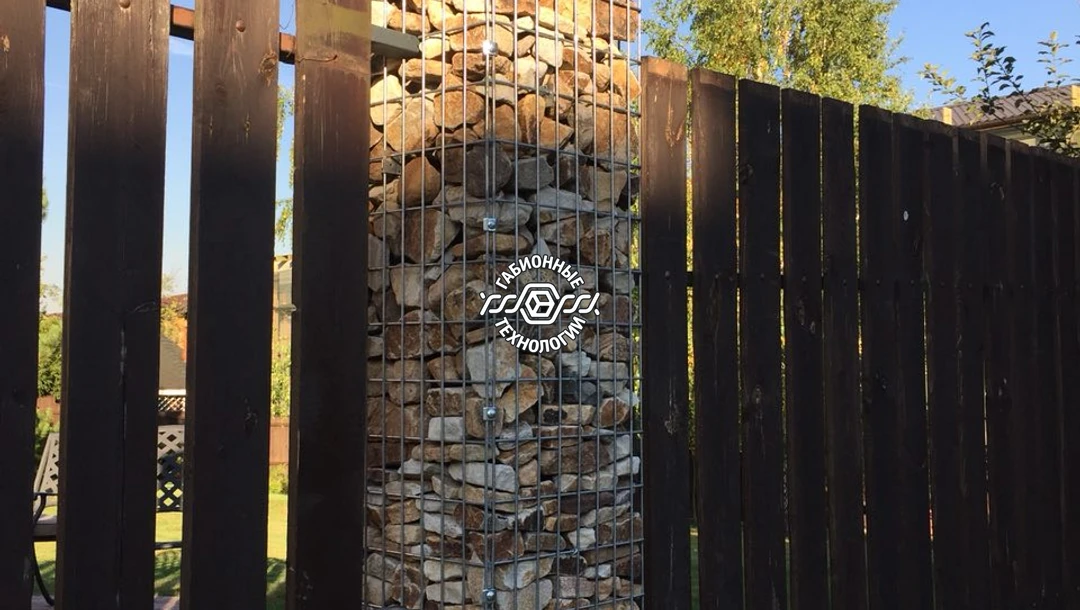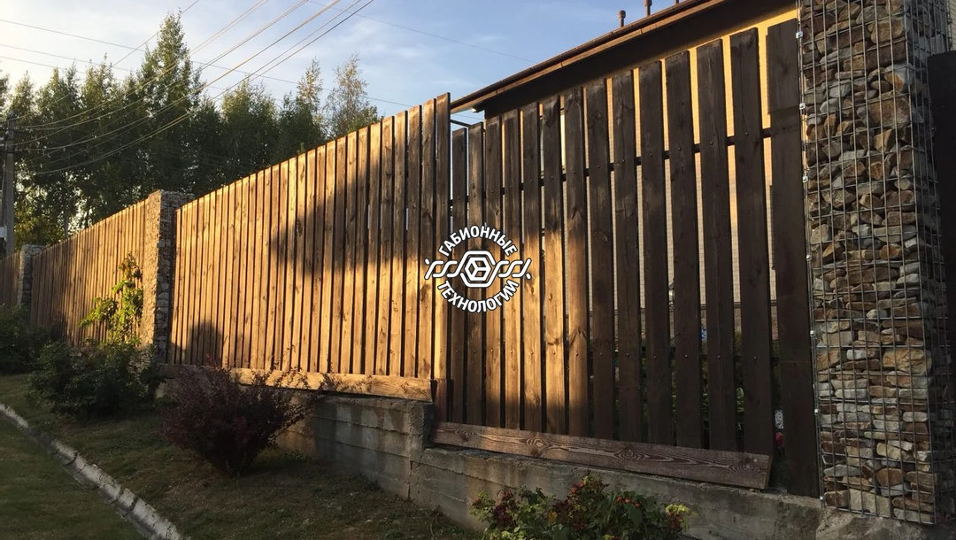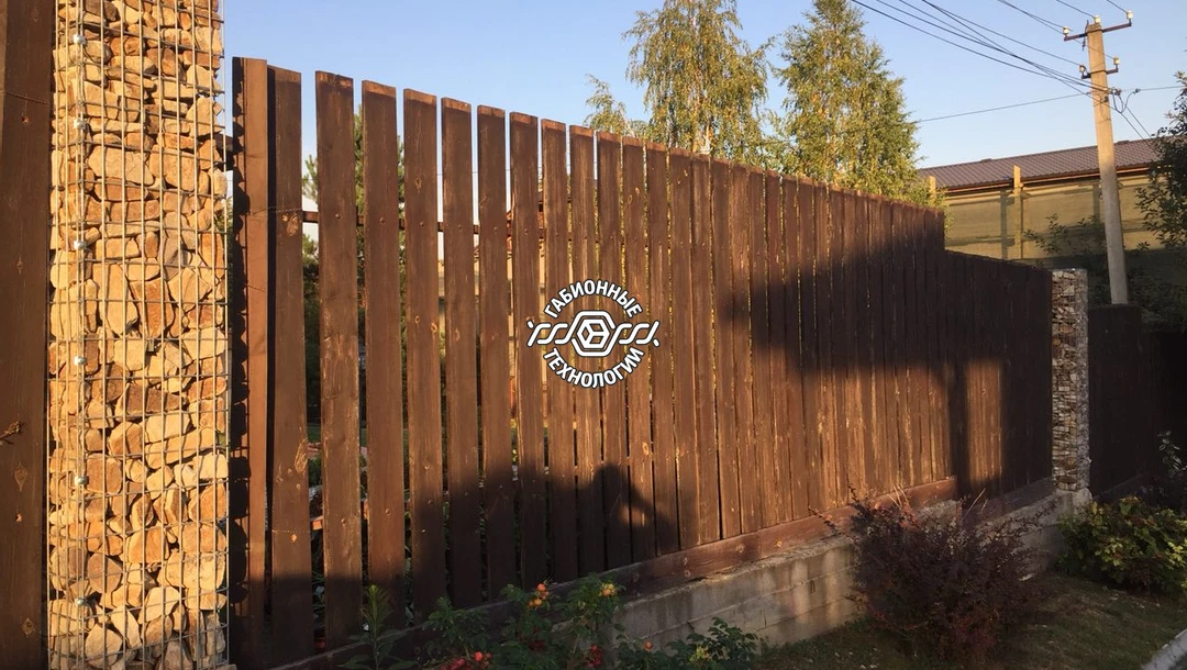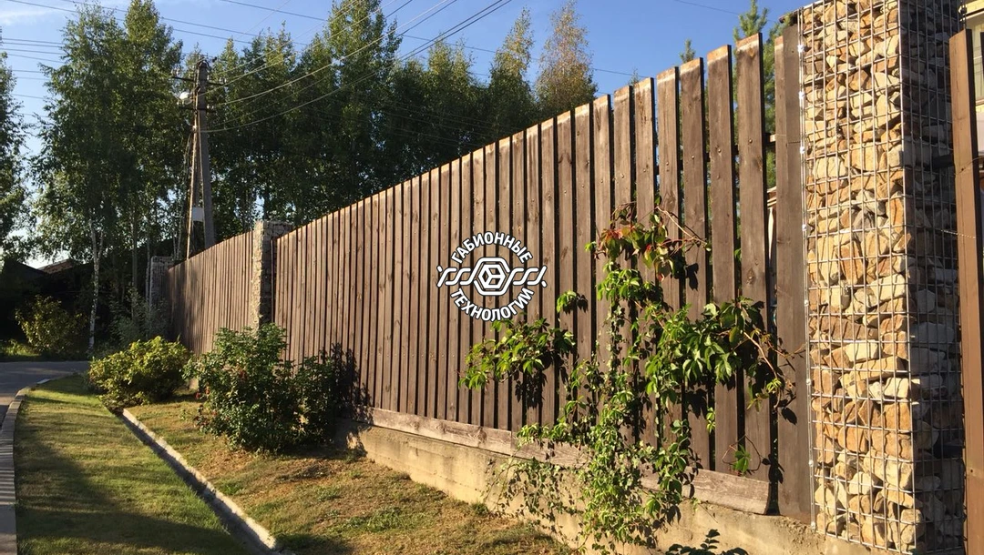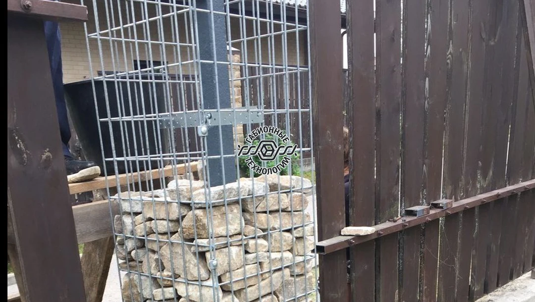 Для создания новых столбов мы использовали сварные габионы производства компании «Реконструкция» . Установили 11 конструкций высотой 2 метра каждая. Полости габионов наполнили бутовым камнем вручную. Теперь дощатые секции и ворота забора гармонично соседствуют с крепкими каменными опорами.