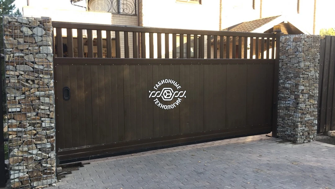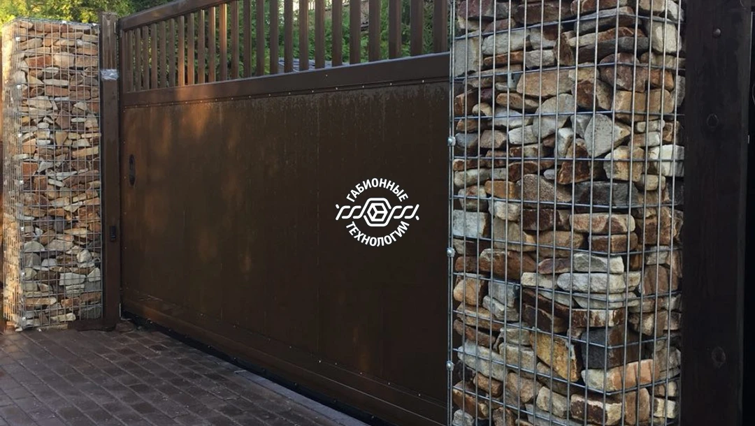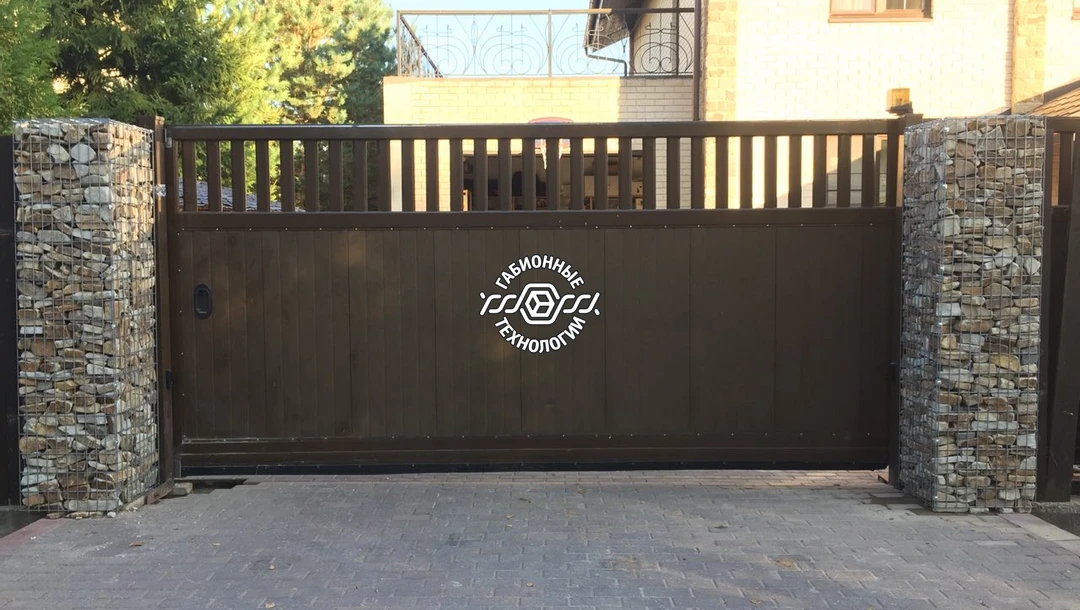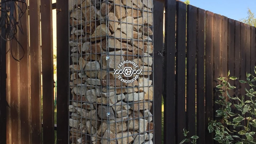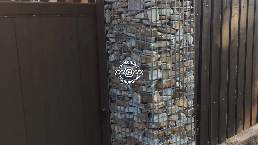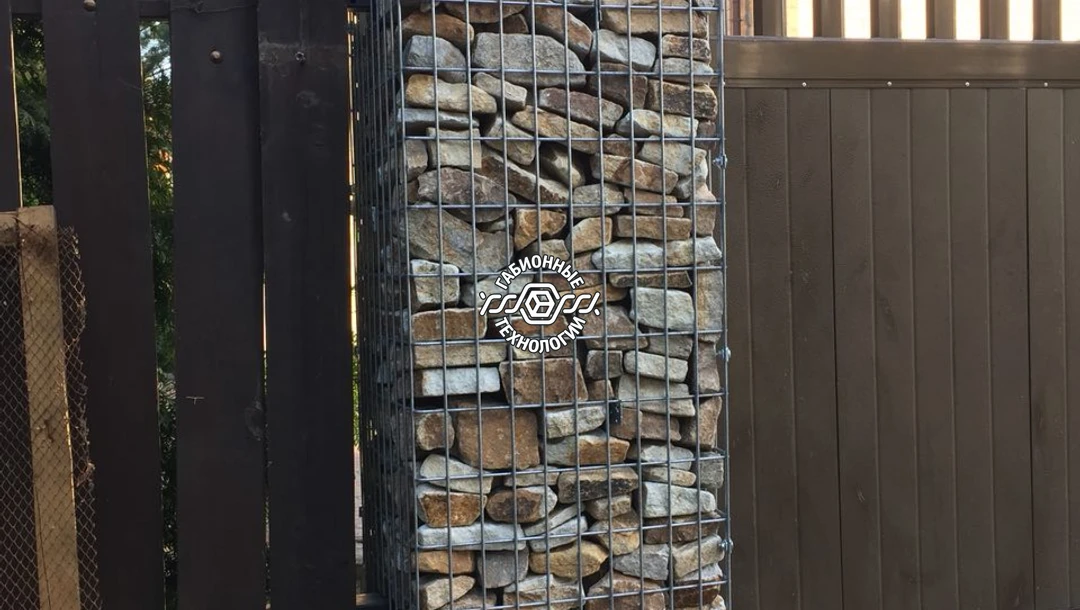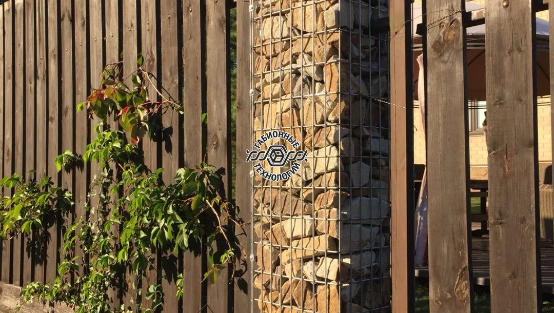 Для создания новых столбов мы использовали сварные габионы производства компании «Реконструкция» . Установили 11 конструкций высотой 2 метра каждая. Полости габионов наполнили бутовым камнем вручную. Теперь дощатые секции и ворота забора гармонично соседствуют с крепкими каменными опорами.