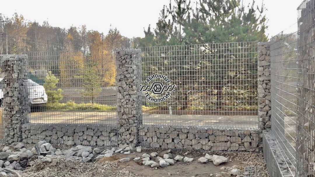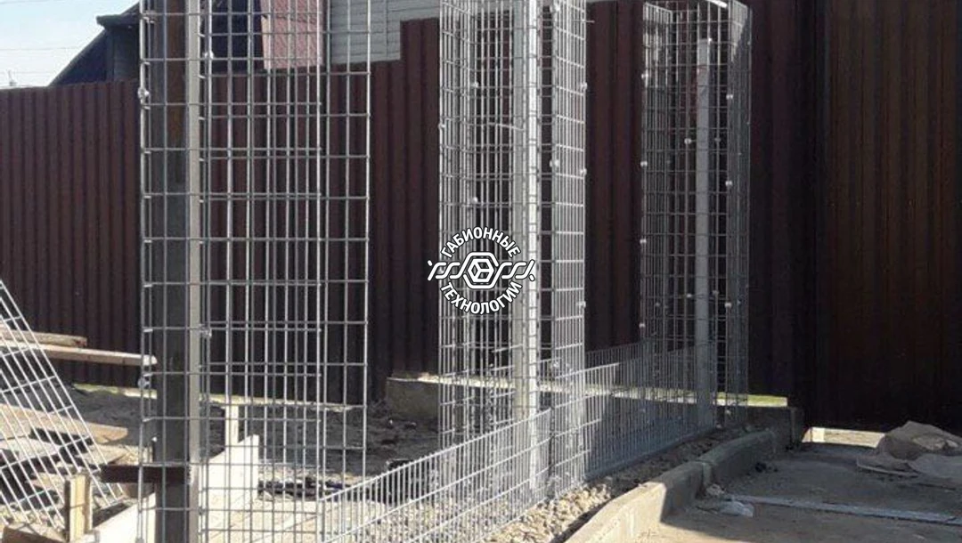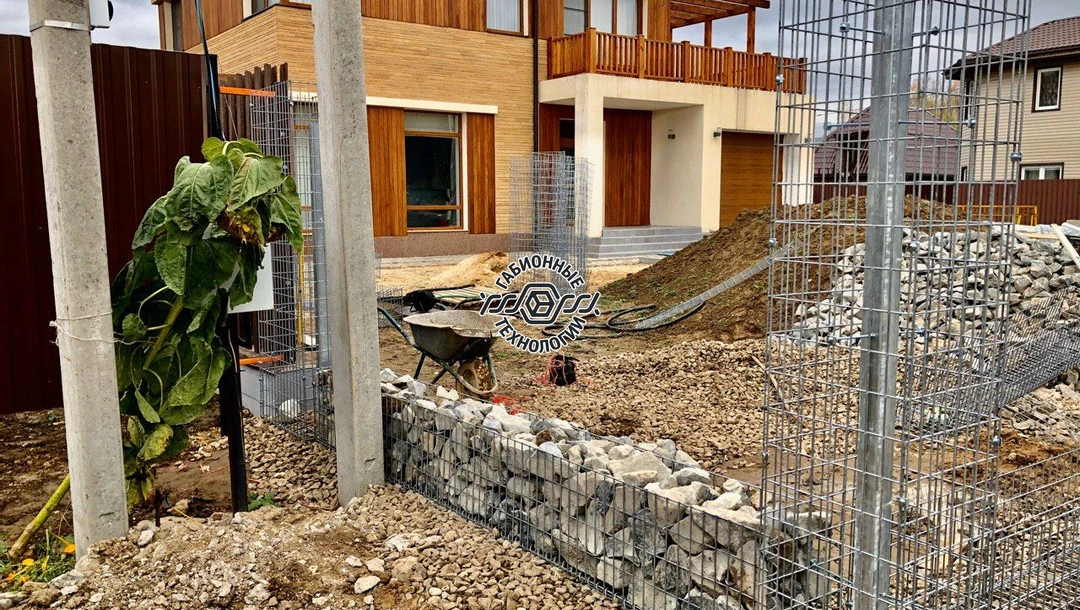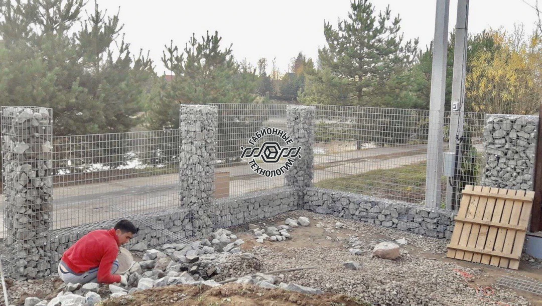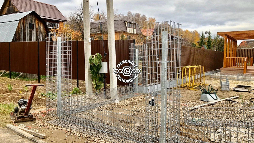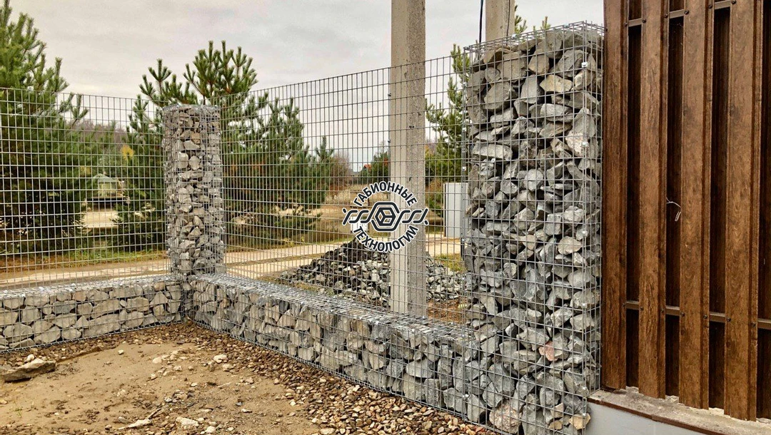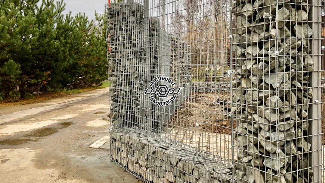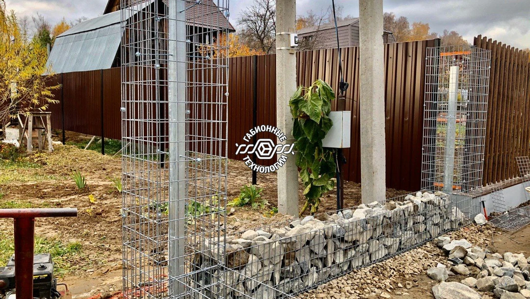 Требовалось соорудить забор длиной 20 метров на частном участке. Цоколь и столбы — из сварных габионов, пролёты — из сварной сетки. Было необходимо строго следовать задумке заказчика, точно соблюсти размеры, предусмотреть проёмы под ворота и калитку.