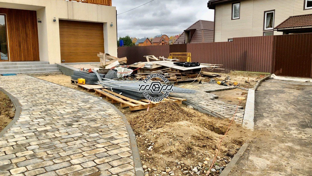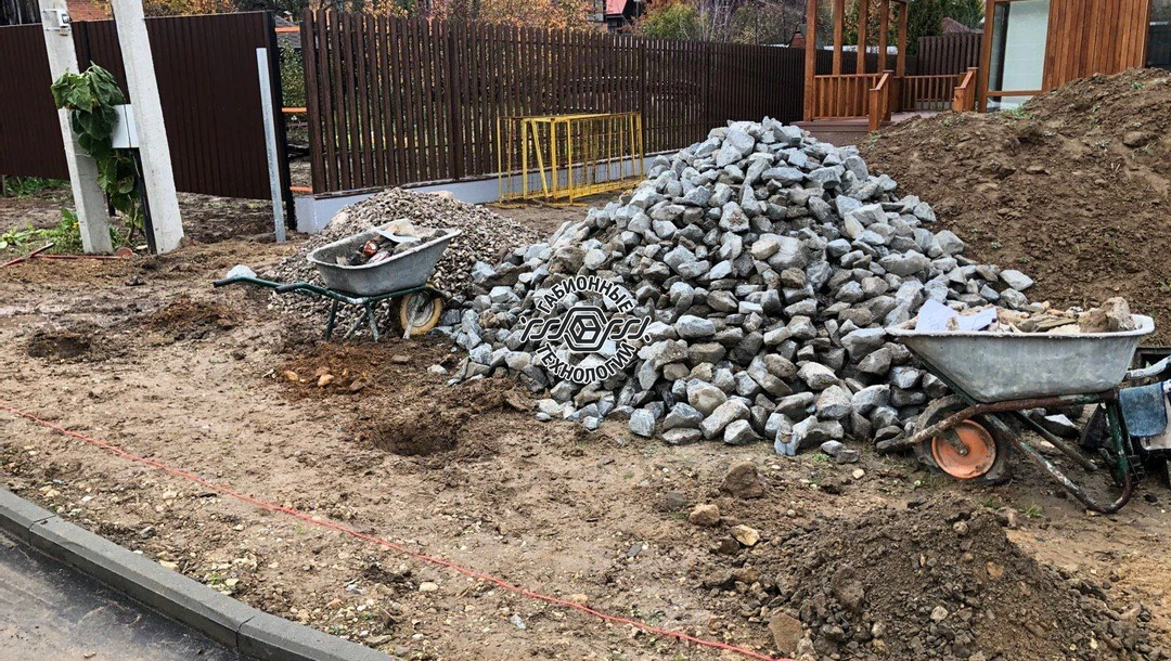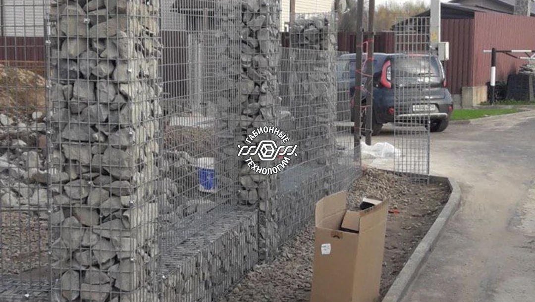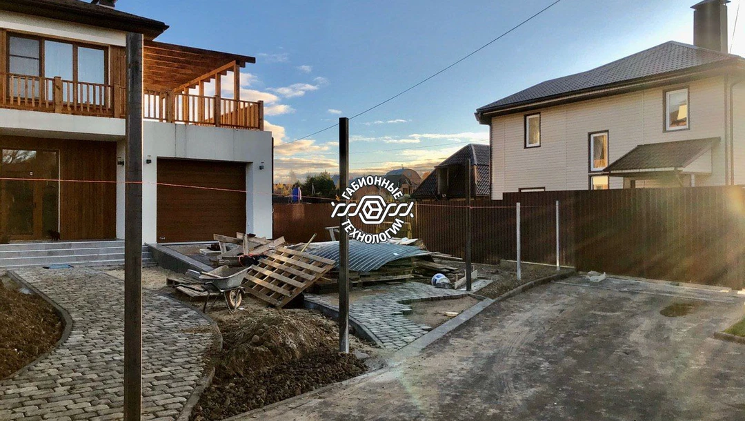 Каменный материал в габионы укладывали вручную (как и требует технология). Наличие пролетов для калитки и ворот позволит обустроить удобный доступ к участку и дому. Объект сдан заказчику в срок.