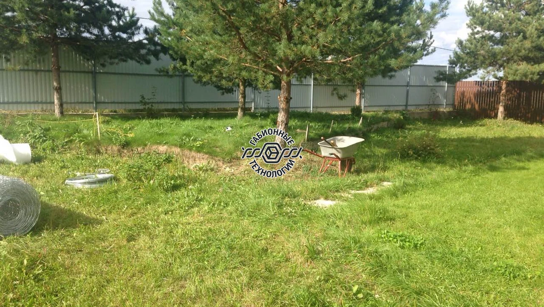 Требовалось выполнить террасирование, создать зону отдыха из габионов и украсить двор. На участке с перепадом высот растут красивые ели, и для заказчика было важно сохранить деревья.