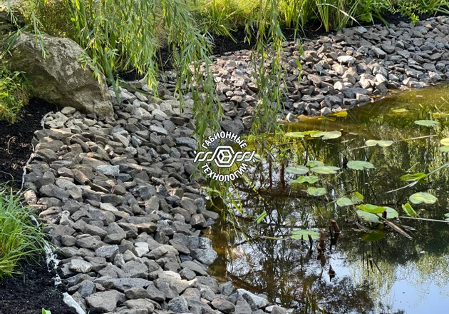 В габионы вручную уложили крупные камни. Так как сетки сверху нет, кажется, что «так оно и было». Берег пруда защищён от разрушения, при этом создаёт впечатление нетронутого природного уголка.