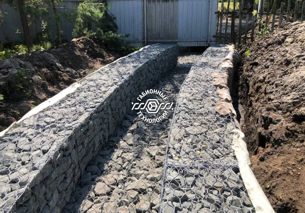 Мы расширили существующее русло и выполнили монтаж габионных конструкций с вертикальными стенками. Использовали матрасные и коробчатые габионы марки «Реконструкция». Длина канавы – 26 метров.