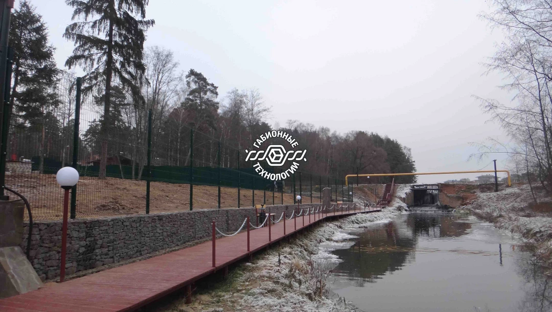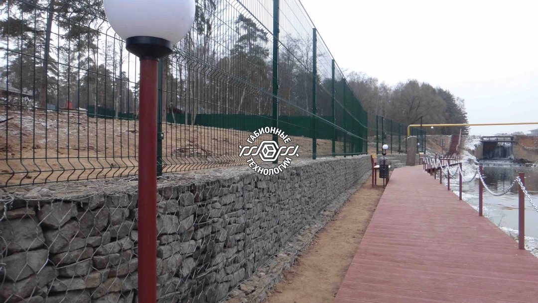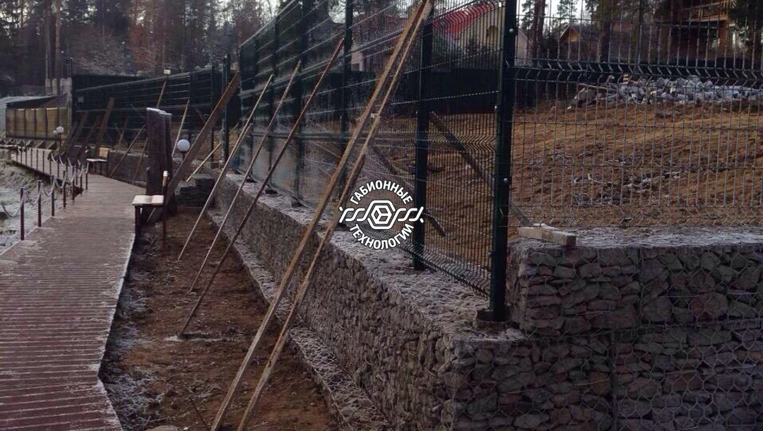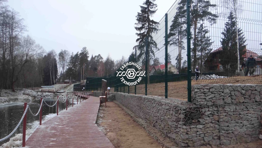 Построена подпорная стенка из габионов и 3D ограждение. Длина стенки - 52 метра. Все работы выполнены с соблюдением технологий габионного строительства и учтены все пожелания заказчика.