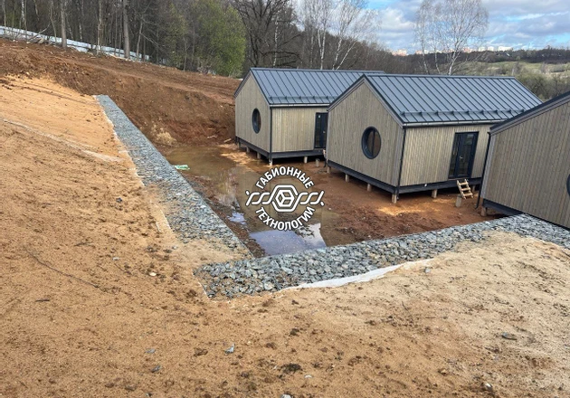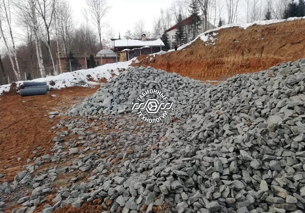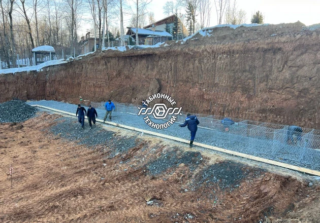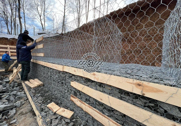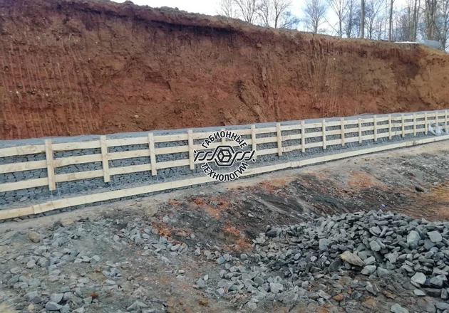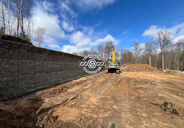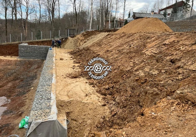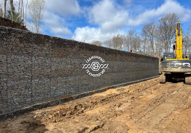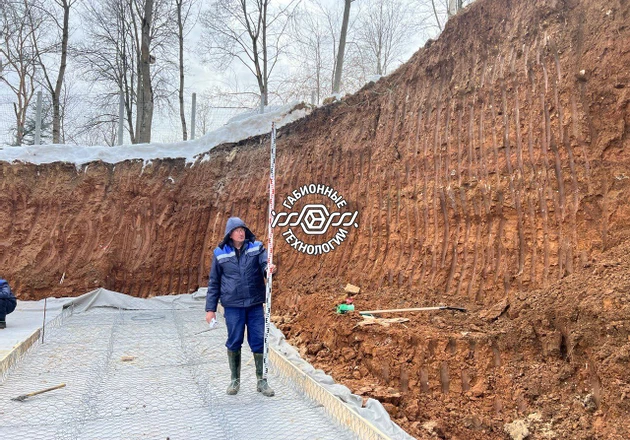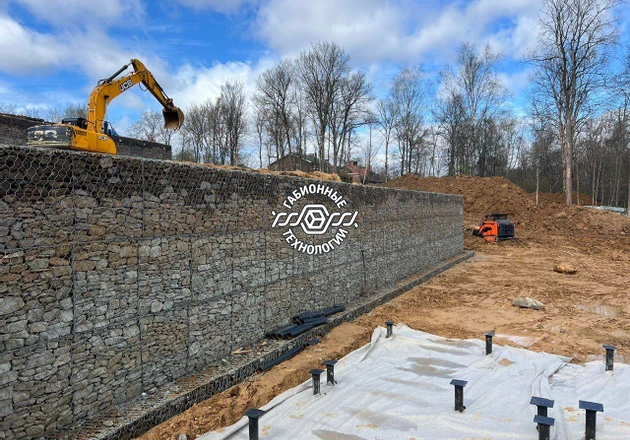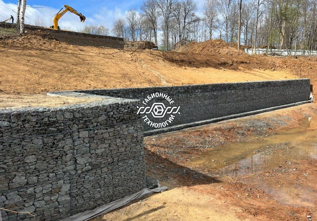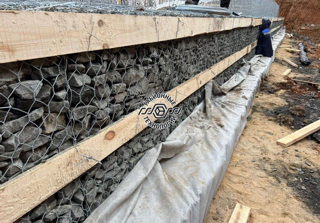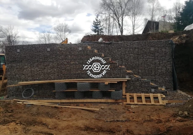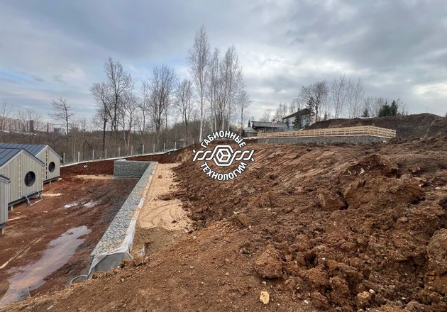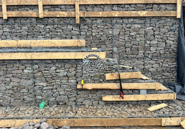 Наши строители уложили 523 кубометра габионных конструкций. Для подъёма и спуска с яруса на ярус в стенках сформировали лестничные ступени. Внутри подпорных стенок — прочный карельский камень.